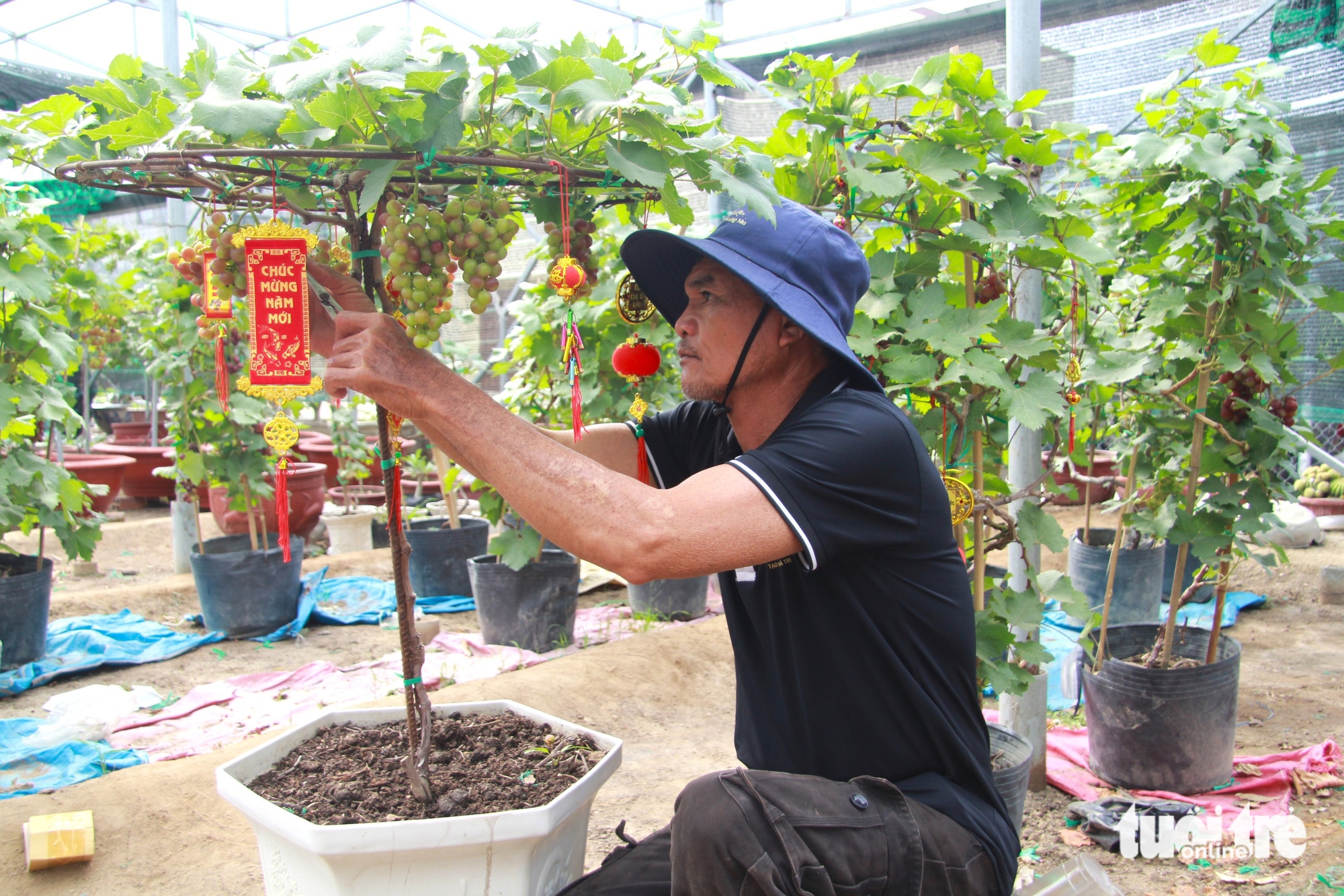 Ông Hải, chủ vườn nho ở xã Ninh Phước, trang trí cây nho cảnh trước khi gửi đi cho khách - Ảnh: ĐỨC CƯỜNG